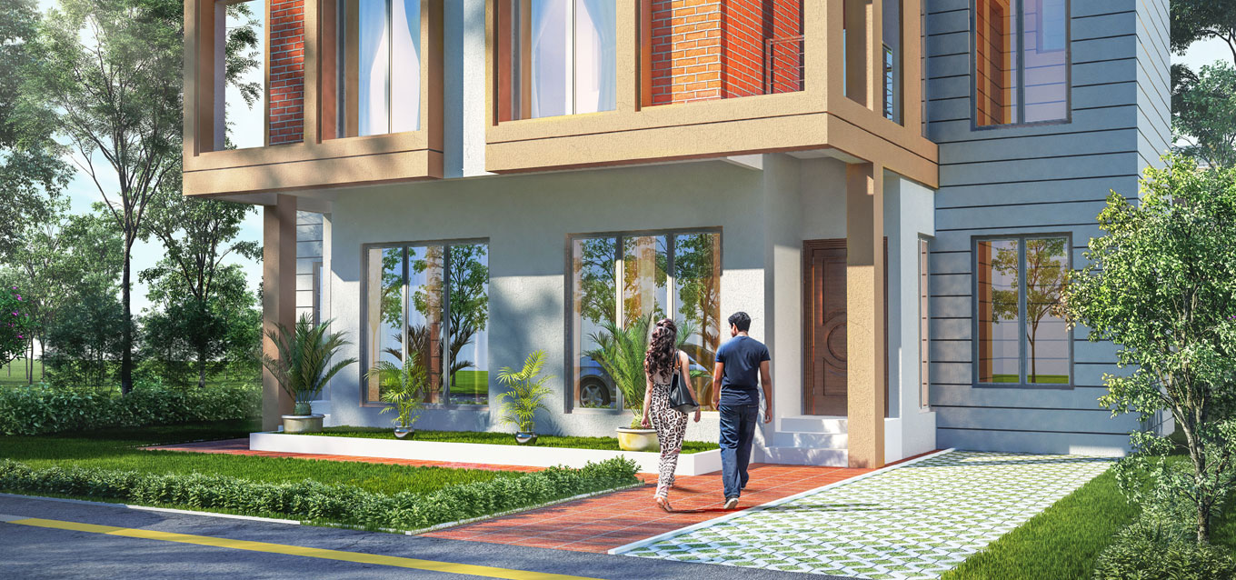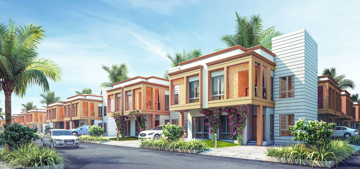 These 3BHK bungalows blend the Indian aesthetic with the changing needs of urban residences to offer a community living experience with sufficient privacy for each plot. The plasterwork is simple with subdued colours, and the exposed brickwork on the frontage gives the bungalow a distinct touch of Indianness.